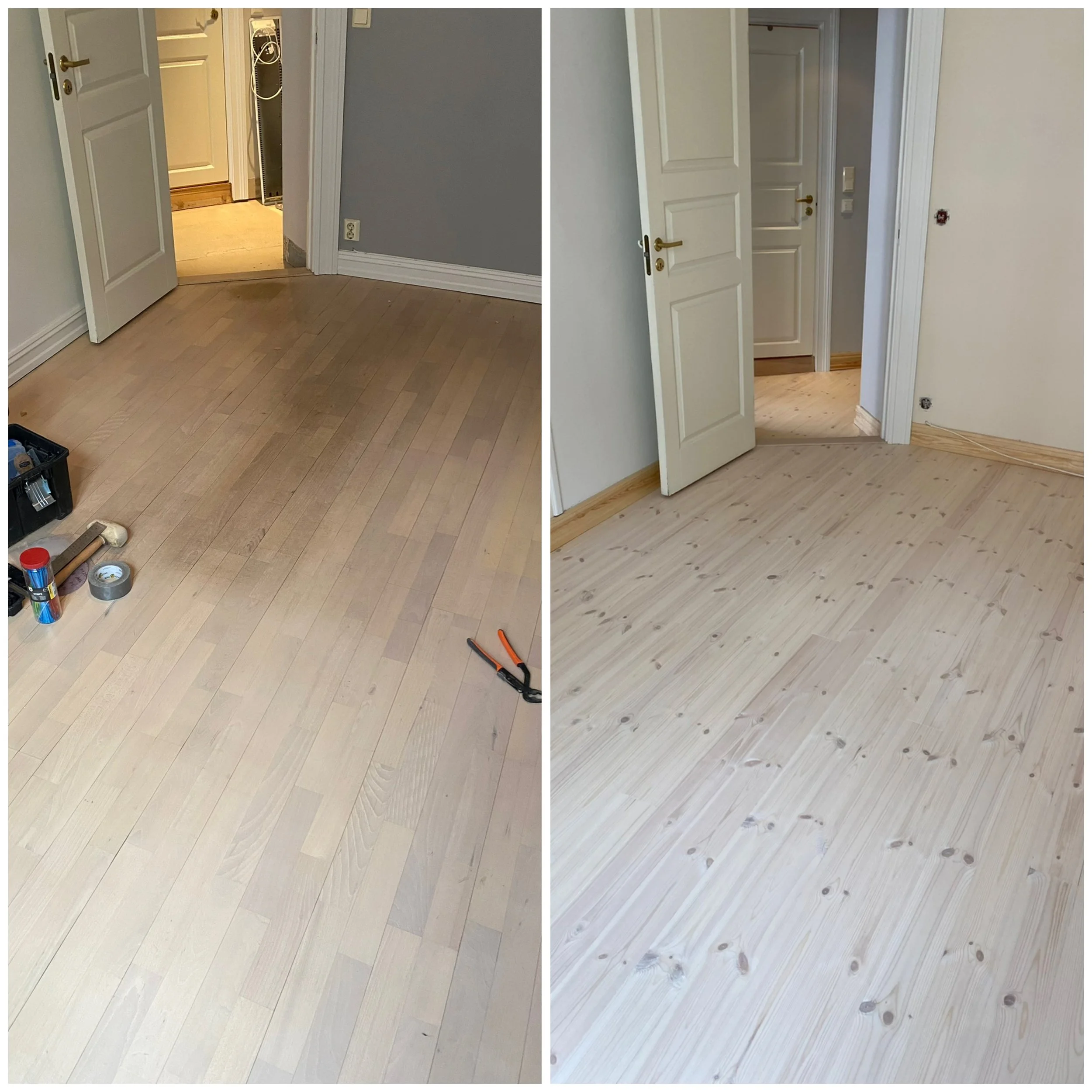 HVITPIGMENTERT FURU: SLIPING OG LAKKING AV ORIGINALT GULV
