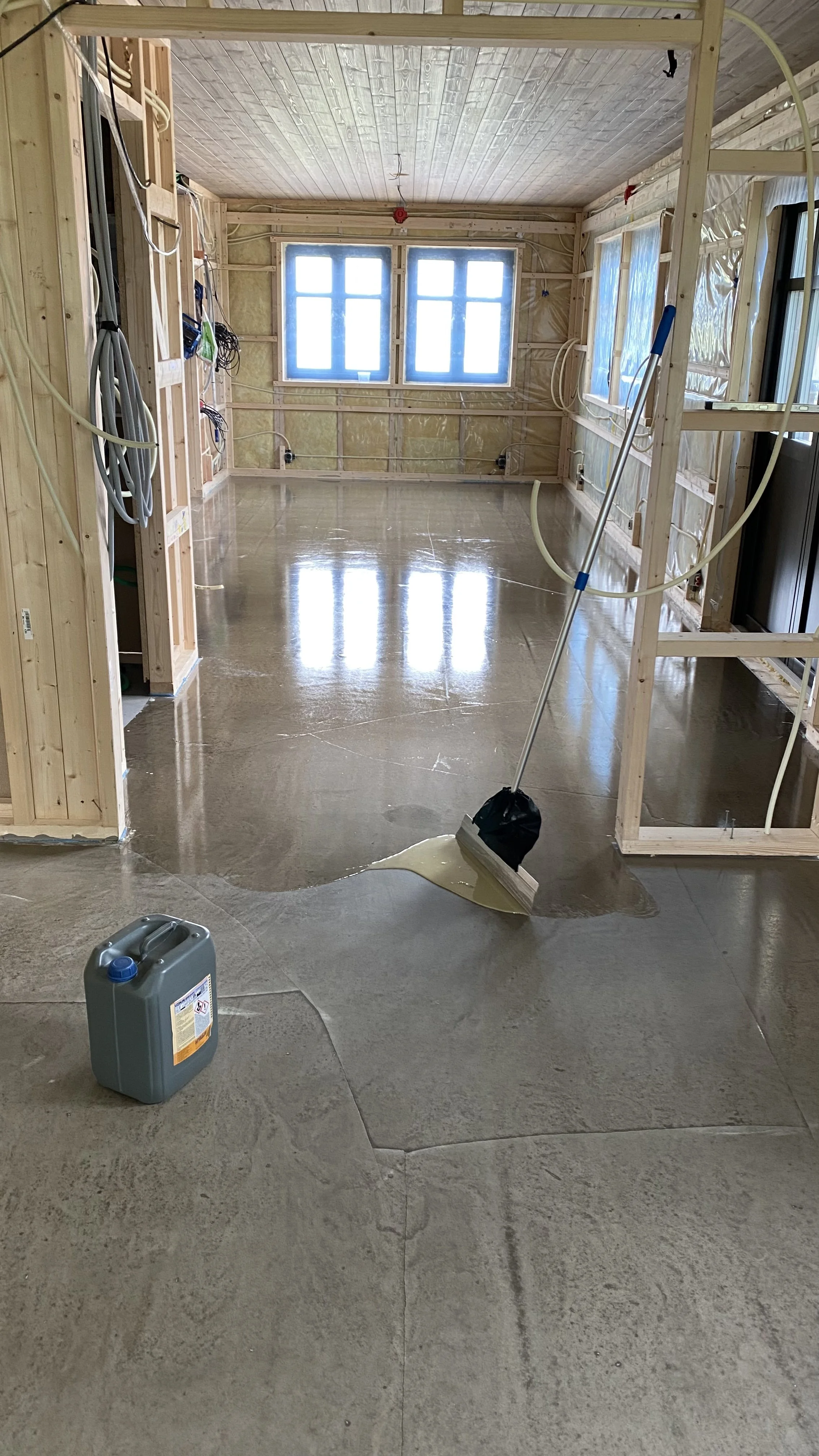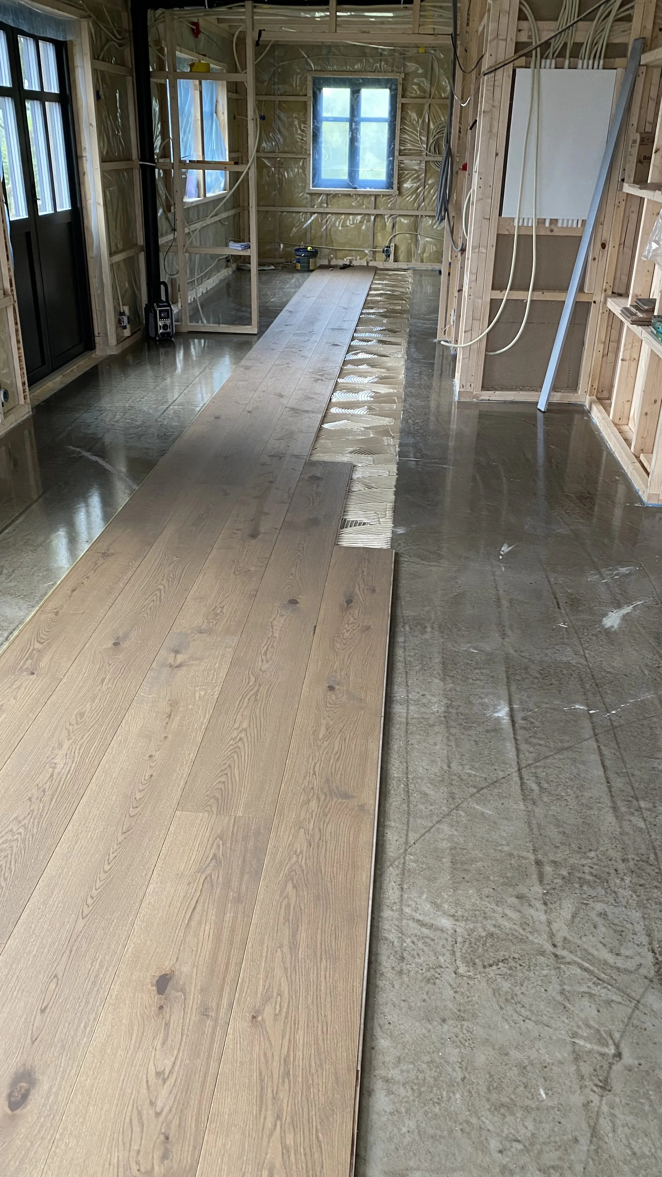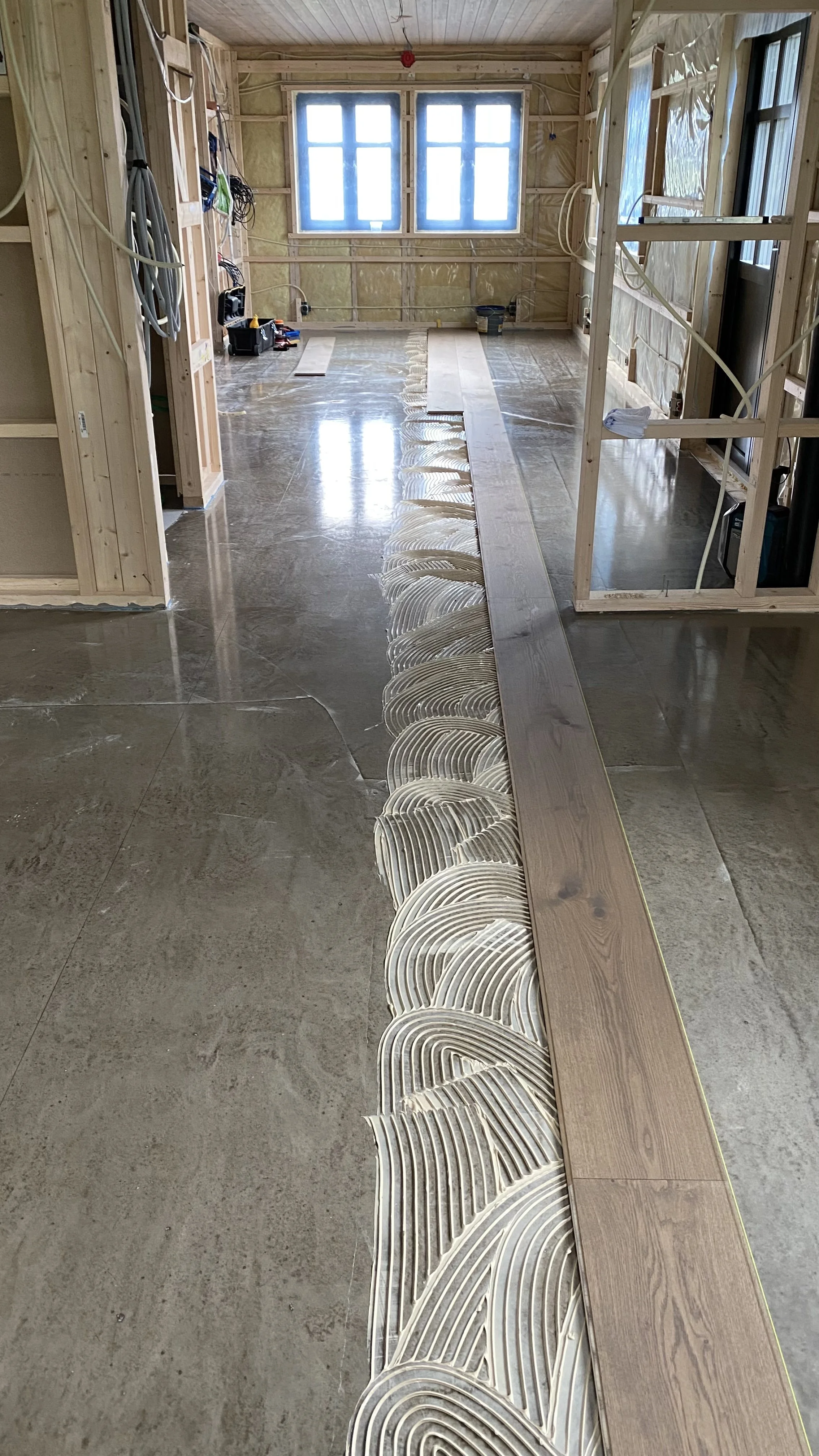 Dette var et enkelt og greit prosjekt. Undergulvet ble slipt, støvsugd og primet to ganger for å danne en fuktsperre mellom avretningsmassen og parketten. Så ble det hellimt studioplank og gulvet ble behandlet med Osmo hardvoksolje. Prosjektet ble utført i samarbeid med Parkettstudio.